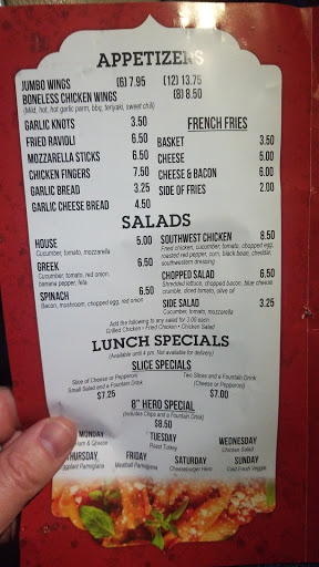 I give this place one star, thats just for the pretty menu. Hey, Ive eaten too much pizza in my life -- living in Chicago for 5 years and in the Boston for 7. These folks claim to understand NY pizza, yet load a pizza with canned veggies and the most forgettable sauce this side of Dominos. I hope that they the Robinhood road location soon so that a real pizza place can come in...