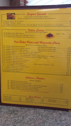 Has been a neighborhood landmark for several generations. Generous portions of food at reasonable prices. Dishes include chicken, seafood, spaghetti, salads, vegetables and sandwiches of all kinds. Deserts for the sweet tooth with a staff that will make you feel like family. One try and you will become a regular ,family atmosphere! Come fill the love!