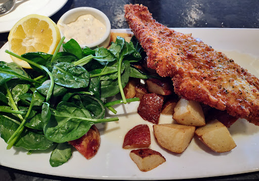 Yum! Not too expensive and delicious food. We sat on the patio with a lovely view. Our table shared tuna and walleye appetizers. The Ahi tuna came with the best Japanese slaw Ive ever tasted but could have used a little more wasabi sauce art on the plate and the crunchy wontons served no purpose and were not tasty at all. The walleye bites had a bit of a kick and the sauce that was served with it was excellent. The dinners of walleye, Pork chop and chicken were all very good. The mashed potatoes with bacon and scallions were great. I also loved how they prepared the spinach which were barely kissed by the pan, leaving them fresh and a little warm, with a touch of buttery caramelized onions mixed in. Im making myself hungry just thinking about the great dinner we had. I can wait to get back there for dinner.