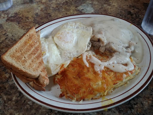 Tasteless food. Their breakfast sausage isnt even good and Ive never seen anyone screw up breakfast sausage. Hash browns and eggs tasted like I was eating nothing; even after liberal doses of salt, pepper, and hot sauce, all I could taste was, well, salt, pepper, and hot sauce. Sausage gravy was from a can and biscuits doughy. My wife and mothers omelets contained canned mushrooms and literally raw, not cooked a bit, onions and green peppers and a really runny sort of cheese sauce that looked like orange water but had no trace of a cheese taste. Had lunch there twice also and I would have given those trips 2 stars for the same reasons, but after this Sunday morning breakfast, Ill never go back. Its basically hospital or nursing home food in a restaurant setting. Its popularity among the locals dumbfounds me.
