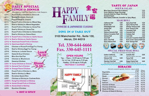 More like Unhappy Family. This place was great when they opened but they have fallen from grace. Not worth it anymore. Went in Saturday September 16 for dinner. Should have done a walk though to see if they had fresh food out. Guess you just expect that. Most everything was out to long, dried out and overdone, carried over from lunch. I used to like this place but have been disappointed the last few times. Sorry Happy family, you lost me as a customer and if anyone asks I will tell them what I told everyone here.