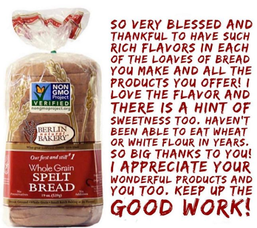 Ive been a customer of Berlin Natural Bakery for a few years, and purchase whole and white spelt flour from them, as well as the occasional spelt noodles and cookies! The high quality of their products, plus the excellent customer service, makes ordering from them a joy. It is so great to know there is a trustworthy source of GMO-free spelt flour for those of us who cant tolerate commercial wheat products. Thanks so much!