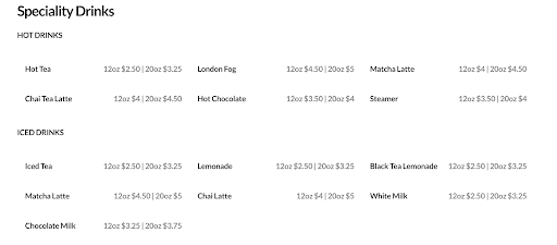 Really nice coffee shop. They have cookies and things like that to eat. Very reasonably priced really nicely decorated. The staff is wonderful!