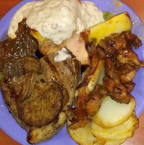 The food is dry an tasteless the ice cream is usually nasty tastes like medicine an lube that they use to put it together the chocolate fountain is never taken down they just reuse it day after day the cakes are so old they crumble the jello is slimy the banana pudding is Ok i have seen the chocolate pudding so old its green an foamy the steaks arent cut in house anymore they come in pre packaged since they have a new owner they cut so many corners its ridiculous they dont make the pizza dough in house none of the pies or donuts the milk usually is so old the cartons they are expired n they give them to people then act like they dont know the ice cream sits in the machine all night with no refrigeration they just leave it sit in the machine the equipment in the back is so old its stained up an crusty the floors are nasty and full of food the salad bar doesnt even stay cold they put ice in it to have it stay cold the soups come in prepacked so does everything else expect rolls n biscuits the smell from the dirty floors smells like garbage definitely needs a throughout cleaning DISGUSTING!