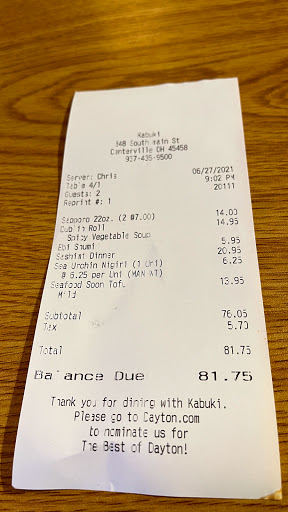We recently moved to Centervile and went to Kabuki due to its high rating as "Daytons Best Sushi." To summarize: Slightly overpriced. Average sushi- definitely not the best weve had in the Cincinnati-Dayton area. Cramped spaces, torn seat cushions, an outdated, tacky atmosphere. Service was friendly but not very professional. Totally surprised and not impressed when, upon ordering two sodas, we received two actual 20oz plastic bottles of soda. Displeased with the "hipster" names (Hot Sex Roll?) for sushi especially when Im ordering and there is a table with children next to me. Would I recommend? Probably not. Will I return? Probably not. Will I order takeout? Maybe, as I said the food isnt bad.