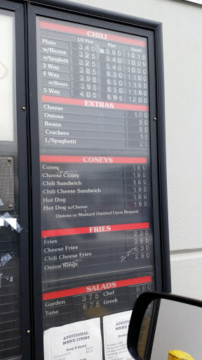 3.5 stars: good, not great. Taste-wise its a solid performer among the various local Cincinnati-style chili purveyors but the chili itself was watery, more so than Skyline or Gold Star. I wasnt impressed with the presentation at all, however. When I arrived shortly before noon on a weekday, the small parking lot was full and I saw no obvious street parking in the slightly sketchy neighborhood. So I ordered a 3-way and a coney at the drive thru and found a nearby parking lot. The coney was sloppy, as is to be expected, but tasted pretty good. The chili was ridiculous, however. First, it was in two containers--one styrofoam cup for the chili and spaghetti, and one for the cheese. Separating them made sense, to keep the cheese from melting, but it was impossible to eat the runny chili-spaghetti mixture out of the cup. The cup was completely full, with a generous portion of unappetizing liquid on top. So there was no way to add the cheese and attempt to eat from the container. Skyline has a perfectly good tray container that holds the chili and spaghetti, and is easy to eat from. Im not writing this place off, but definitely cant recommend getting it to go unless you happen to have a plate or a bowl of your own handy.