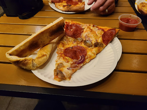 Delicious New York style pizza by the slice. Only $3 for a slice of cheese pizza the size of your head. The bread sticks are good too, and they come with a cup of dipping sauce. Fast service. We went at peak time on Saturday night and didnt have to wait longer than 10 minutes.