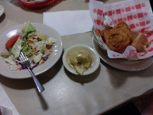 Let me start by saying I was very close to giving it 5 stars but there were a few things they could improve upon. When you first walk in its hard not to leave because there is a bad mold/mildew odor. Within 15 mins we didnt notice it anymore though. We shared potato pancakes for an appetizer and those were the best Ive ever had. I knew even if everything else sucked Id be back for those! For dinner I had chicken fried steak, mashed potatoes and fried corn on the cob (dont bother going if youre counting calories or are a vegetarian!). I was immediately disappointed that they put chicken gravy instead of white gravy on it but it was still very good. Mashed potatoes are instant but doctored up so that they are still good. First time Ive ever had fried corn and it was good too! Save room for pie, because its homemade and good! I had banana cream pie and it was well worth the extra money and calories! My mom got the deep fried "donuts" I dont remember what theyre called. She said they were ok, a little to crunchy though. I dont think shed get them again. Ill definitely be back to try the fried chicken and breakfast. It would be great if that was offered all day!