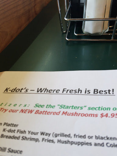 I really like coming to K Dots. The KDOT white fish is wonderful. You can get it grilled or blackened. Sometimes the service can be slow, BUT the food is made just for you . The desserts are homemade and very good.