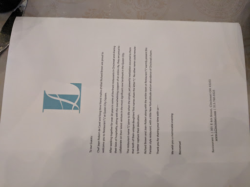 Hooray for Jean Roberd and Richard Brown. "L" is magnificent. The setting is elegant. The food is spectacular. The staff is friendly, knowledgeable and low key. The foie gras could be the best Ive ever had. The wine pairings were well done. Cincinnati, lets go! The experience compares with going to the finest restaurants in New York. Think Restaurant Daniel and Cafe Boulud.