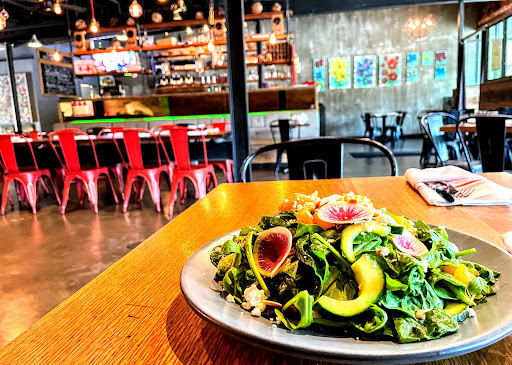 Really wanted to like this more than I did. Ive been twice in three days. First day had the pork two ways. Pork belly was good, but the chop was dry and flavorless. Second chance had the Steak Frites. Meat was cooked perfectly, but again had no flavor and was topped with a weird gravy (red wine I think, but just strange). Both times I tried the wings (different kind each time) and while they were fine, there was nothing really special about either kind. The atmosphere is fun and I love the decor, but it is really loud, and dont get a table neat the garage door, because the sun will blind you. Service: Wait staff was great. Attentive and helpful. But, we waited so long for our appetizers that by the time they came the mains were almost on the table. Really, the beat thing about it for me is the great selection of beers on tap. Next time I think Ill just sit at the bar and have an app. Hoping that in the next few months things get better and hope to make it a regular.