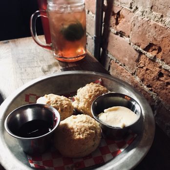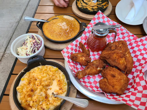 Really wasnt that impressed. The chicken was good, but Ive had and made better. The pieces were small, the skin wasnt very crunchy, but did have a good flavor. The spicy honey was good and unique. The sides were less than good. The cold mac and cheese with 1/2 inch of panko on top, super garlicky. You would think that since its served in an iron skillet it would be at least warm, but it was rather cold. The skillet was hot though! The spoon bread wasnt. It was corn bread. While it was very good corn bread, it was a tad on the dry side and definitely needed butter! The Saturday visit was a 2 hour wait, so we came back on Thursday night, and didnt have a wait. We sat down, after SQUEEZING through to sit at the back side of a large table with 3 guests at the other side. It was extremely loud, so much that I and the wife decided that it was not worth even trying to talk, so we sat and watched each other. It is really just a bar that serves chicken to people after you have had quiet a few beers. The staff was friendly and you could not ask for anything better. Please note that I do not drink, so I cannot comment on the vast beer and alcohol selection.
