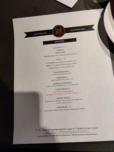 We had an excellent dinner at Nuevo. We had reservations for 7PM on a Saturday night and we were seated promptly. We would have liked the second floor but they had a private party going on - good to know they have a room available. We ordered the three types of guac (1. Habanero Jelly 2. Escabeche Corn Fresnos, Poblanos and 3. Cucumber, Mint, Cotija Cheese) with chips, all three were very good but we liked the corn one the best. We also were very impressed with the tequila list - we decided to try the Three Amigos, where you get three shots (1/3, 1/3, and 1/3) of three different types of tequila. The brand we tried was Espolon - very good and I actually went and got some the next day! That was excellent and so much fun! Our waiter suggested the brand and seemed very knowledgeable about the tequila brands. We then order full shots of the brand to get more of a tasting. Dinner was very good - carnitas substituted with the Polenta Roja and Huitlacoche Spoon Bread and the second entrée was the Pan Roasted Airline Chicken Breast, Sweet Corn and Truffle Flan, Wild Mushrooms, Charred Heirloom Tomatoes, Cumin Chicken Jus. The portions were large and very filling, we didnt have room for dessert! Really enjoyed dinner and looking forward to returning.