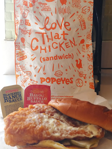 Popeyes chicken is the best. This site can get really busy at the rush times. The speaker on the drive thru is terrible so speak clearly and loudly or you never know what you will end up with