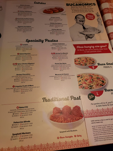 I have been here a few times and it has always been an interesting experience. The pastas are good and large. There was a dish that sounded really good but it had spicy sausage in it, which I do not like (I cant do spicy foods and sausage makes me feel like I am going to have a heart attack). I asked them if I was able to substitution the sausage with chicken instead and they were willing to do that at no additional charge! The meals can be expensive but if you use the $10 off $20+ order coupons when they are available this helps out a lot and gains them even more business from me. The one complaint I do have about it there however is the bread. The bread they serve is really not that good and it is cold. I have had bread from "OCharlies" and "Bravo!" restaurants which were warm and freshly baked out of the oven, but Buca does not do that. If they were to serve warm bread with a better dipping sauce then the rating would probably be 5 stars!