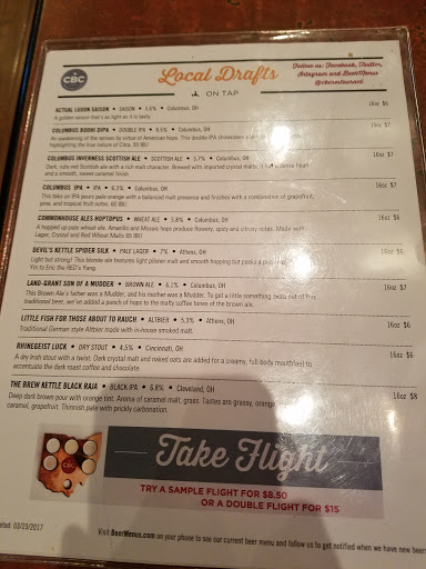Despite it being the Columbus Brewing Companys restaurant, the beer menu was dominated in number by beers other than CBCs (albeit local ones), which I found extremely odd. We ordered a flight which included the two beers of theirs that were available and they were decent, but there seemed to be none available to purchase and take back to our out-of-state residence, on premise or locally at stores. The food here was just ok and the service was fine. I was expecting was more of a tap room setting and perhaps with more interesting food selection.