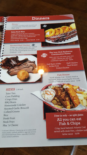 My husband and I have been coming here for about 2 years now and is absolutely one of our favorite places. It used to be Pig Iron and had different owners ...I was not a fan of Pig Iron at all. When my husband and I stopped in after the new owners took over and renamed it Iron Grill..we were very impressed. They go all out on their food. The southwest chicken salad, ribs , burgers and BBQ are terrific. I love rib night on Tuesdays. They have the best ribs around . I have never had anything I havent liked. Their steaks are also great ! They have great specials and the owners and staff are super friendly. And the cheesecake....the BEST EVER ! It is a must try for everyone. We have never once had a bad experiance. Great atmosphere with great food and people. Would 100 percent recommend.