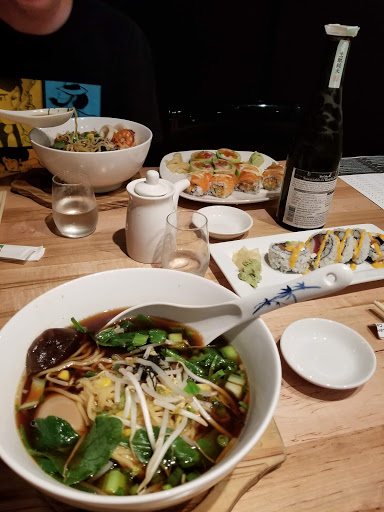 I cant believe I have been walking by this place for 3+ years and never stopped in!! I finally gave it a shot after my BFs coworker raved over it! And I have to say, he was not mistaken. The music was just the perfect setting for the atmosphere (light EDM) and the food complemented everything as well! As it was a cold winter day, I went with the Chicken Ramen dish, and it was perfect! Kinda like pho, but with that ramen noodle twist! Also ordered a few sushi rolls, and they were so so so good! Everything tasted fresh, was served fast and left my BF and I filled to the brim! Needless to say, I will be returning. Update** And return I did.. but this time the ramen dish was not so great. I went with the veggie ramen bowl and it was all outtawhack! I asked my server a few questions about it and she explained that the kitchen staff was completely new and they changed the recipes around. Well, that explains it. The noodles were undercooked and flavorless, but everything else in the bowl was fine. So in my crunched lunch hour I didnt send it back. The sushi I ordered rocked, once again. If anything I will try something else on the menu next time other than the ramen bowl.