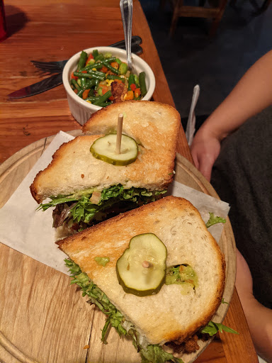 I absolutely LOVE this place! The dim lights, the great selection of beers and their FOOD is amazing. We had a german sausage with a duck egg on top and some arugula, if Im not wrong, and it was to die for. Also their fried pickles were delicious. Service was beautiful. This was a suggestion from a local who was walking by and it was GREAT!!!! If youre San Fran, definitely stop by!