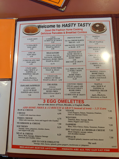 If you want comfort food and fast service, come and eat at Hasty Tasty especially for breakfast. The waitresses are homey and talk you with a bit of an attitude, like its your mother or aunt. I love it. Theyll give you a ton of food and fill you up and still leave money in your wallet. Im 31 now and still drive 30 mins to eat here. Come and be yourself in this laid back atmosphere.
