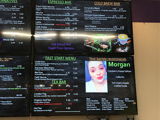 The drinks are okay, nothing special, but where this place really shines is the baked goods. Nothing is frozen or pre-made, its all baked in-house and it is all AMAZING. Seriously, I am usually a person who cant stand baked goods and rarely even eat bread, but everything I have gotten from the Fresh Start has been delicious. Light, flaky pastries, moist and delicious cupcakes, cinnamon rolls... oh my god, the cinnamon rolls... My moms a big fan of their quiches. My favorites are the danishes and the poptarts (which are to normal poptarts like filet mignon is to a fast food burger patty). This place is perfect for a quick and delicious breakfast, and the staff have always been friendly too!