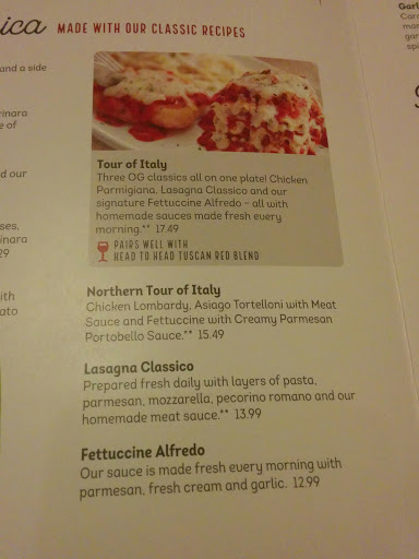 The food was pretty good tonight. I got the northern tour of Italy. Im giving a 3 out of 5 instead of 2 because of that. Walking towards our table I noticed right away a disgusting smell. It was like something got into the carpet and they tried to clean it or cover it up and it just wasnt working. Then when leaving I went to use the restroom. Ive seen some pretty disgusting restrooms, but in a restaurant that charges add much add they do for a meal, this was the worst Ive ever seen. Water all over the floor, overflowing trash cans, terrible smell, and they were not busy. The service from our waitress Samantha and the food are the only reason I would go back.