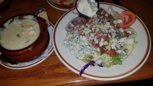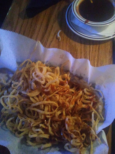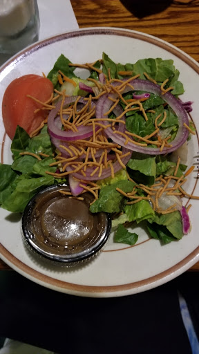 It is a journey to get to this place and then you cant even tell if its open. All you see is this and some trees around you.. So at night it can seem pretty creepy. Inside is the typical low lighting that you can expect from a steak house. Although it seemed to be lower than what is comfortable. The food overload that you get from this place is worth checking out. I would skip all the fried stuff on the menu. It wasnt done so well and it was just plain extremely greasy. The steak was presented very nicely but it was so tough and lots of tissue to chew through. The saving moment of that was the apple sauce that went along with the steak.