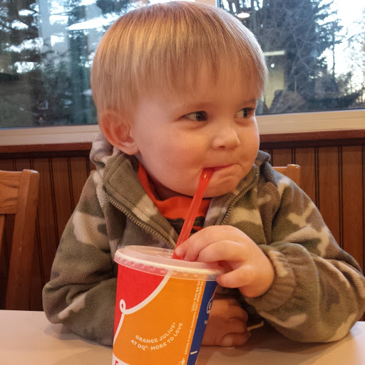 Long weird drive thru..been this way for years :( Then when you get to the window to pay their are dumpsters too close to the right with hoards of bees. Food is ok, ice cream is not the same as the old days....