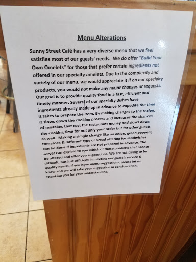 A Frustratingly Terrible Experience I had good intentions of taking my wife out to a great breakfast, but it was unfortunately ruined by this establishment. When we arrived, we were happy to see that they werent very busy, as there were quite a few booths available. They seemed well staffed as we witnessed tables around us being waited on by two people, plus a manager (also assumed, as she was going table to table talking to other customers about their food). That was the frustrating part of our experience. We were seated and told that our server would be there shortly. Well, a half hour and two attempts at flagging down a server later, and my wife and I were on our way out. We didnt even get a chance to order our drinks. We sat there, for thirty minutes, without even being acknowledged. For the first 15-20 minutes, I attempted to be understanding. Maybe there was a shift change. Maybe our server was just generally busy. At about the twenty minute mark, I started flagging down servers, but was completely ignored. The manager (again, assumed) who was speaking to the table next to ours was wrapping up the conversation, so I decided that Id wait so that I could speak to them about our experience. However, even the manager skipped our table. At that point, I felt invisible and generally unimportant to the Sunny Street Cafe, so I looked at my wife and we decided that we should go elsewhere for our breakfast. Frustrated and unhappy with our experience, I did something that was completely out of character for me. I called the Sunny Street Cafe to speak to the manager, wanting them to at least be aware of our experience. I was then told that the manager was "not available." The employee that I spoke to on the phone seemed completely unconcerned towards our experience, almost to the point of her sounding rude. It seemed fitting that we had been ignored for a half hour while we were waiting, only to be ignored once again on the phone. Oddly, we were told to, "Have a nice day!" on the way out by a couple of employees, but what is interesting, is that it didnt raise any red flags to any of them that we had not paid (you pay at the counter, not at your table). Needless to say, we wont EVER be going back to the Sunny Street Cafe and would advise others to do the same.
