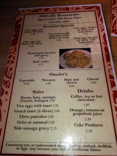 One of my clients asked me to take him to the Millville restaurant for breakfast this morning Saturday, 7/8/17. I was very happy to do so because when my father retired from being a Rear Admiral in the Navy for 28 years in Connecticut, he and my mother moved to Hamilton, Ohio. I would come to visit them from Connecticut and we would go have GREAT HOMEMADE BREAKFASTS, LUNCHES, DINNERS & DESERTS! I now fortunately live in Ohio and have for 15 years & I am making this my last move! I love the people. I do not take anything for granite. I can not possibly tell you how wonderful Gina, James &.Cameron are always going way above & beyond to satisfy all our needs! THANK YOU ALL VERY MUCH-I CANT WAIT TO GO BACK!