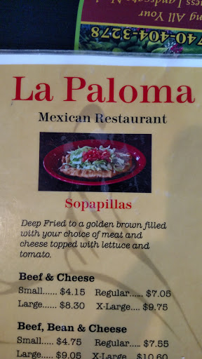 My friend and I wanted to try out a new "Mexican" restaurant for cinco de Mayo...so we went to this place for it had fairly positive reviews. When we entered, there were already red flags to head for the exit. Not a single employee had a drop of Hispanic blood which does not necessarily make it a prerequisite for a Mexican restaurant, but it is usually not a good sign. Second, the air was filled with the smell of deep fried pastries; more like a donut shop rather than Mexican cuisine. Third, we were not greeted at our table by a complimentary basket of chips. Instead was an industrial sized plastic bottle filled to the brim with the blandest salsa Ive ever tasted. My friend ordered some chips which came in a small bowel at the tune of $2. The stale, bagged chips were an excellent compliment to the bland, tomato paste salsa. Although things already looked (and tasted) bad, we decided to give La Paloma a second chance with their menu. There were positive reviews about their sopapillas so we each ordered one. When the waitress asked if I wanted sour cream with my $9 meal, I made the incorrect assumption that it was included. A sit down "Mexican" restaurant that charges for chips AND sour cream: La Paloma you ARE one of a kind... Our food was brought out rather quickly and the large sopapillas which dwarfed our plates looked pretty appetizing. The deep fried meat pastry was covered in shredded lettuce and diced tomatos. For a moment, my doubts about this restaurant fleeted...until I took a bite. The pastry dough itself was clearly a special, homemade recipe which had a sweet, flaky taste. This was clearly the reason why La Paloma has positive reviews. Unfortunately, the handcrafted dough-pastry was filled with the most generic, store-bought, tasteless fillings. All I could taste was Colby cheese. I could not taste the beef at all and the beans tasted straight from a can. I asked the waitress if there was hot sauce I could dowse this abomination with and she pointed to the red towering tube of blandness. I asked if there was anything hotter, and she brought out a green plastic bottle which was made with jalapeños. The green salsa actually had some heat and helped cauterize my taste buds from the terrible taste of the sopapillas. I could only eat a third of it and my friend ate about half. Overall, La Paloma is right to boast in the fact that they are not your traditional Mexican-American restaurant...they are far from it. Save yourself a trip and money and go to Taco Bell. (At least some of their items come with sour cream)