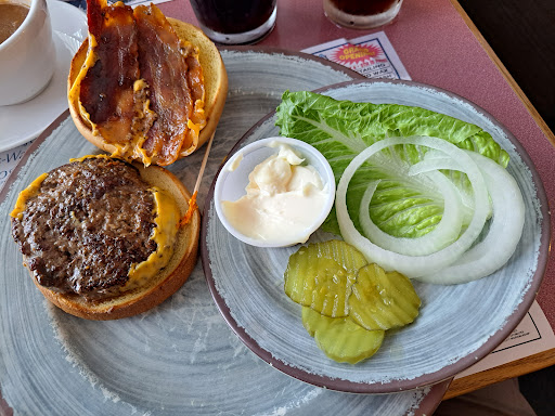 I had Beef and Noodles over Mashed Potatoes w/ coleslaw. My dining companion had a Sunset Burger. We shared an order of Battered Mushrooms and an order of Pickled Eggs. Beef and Noodles were just like eating at moms houses with homemade mashed potatoes as well as the pickled eggs. They were not out of a jar and we could definitely tell. The burger was a reasonable size burger with a delicious grilled bun and yummy toppings. The burger was slightly crisp around the edges, not burned. Delicious! We had a difficult time deciding what to order. There were so many choices of homemade deliciousness. For dessert we shared a Butterscotch Lush dessert. It didnt have a strong butterscotch flavor but was very tasty nonetheless. There was only one server and she was really hopping to keep everyone happy. Very courteous. It is a nice, clean, quiet place to dine with a full bar behind a wall that keeps the dining area separate from the bar. Bathrooms were very clean. We will definitely return. This place is a hidden little gem that is worth the trip.