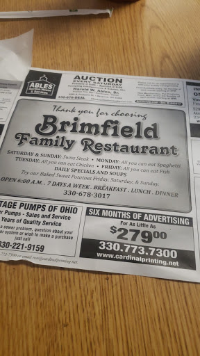 locals say that brimfield family steakhouse has the best fish fry, so i had to try it out. i like ricos better, but bfs has some pretty good food. i liked the potato wedge fries.booth seats are very close, so be ready to watch other people eat if you want the comfort of a booth. nice view of golf course out the front windows and many locals come and go.