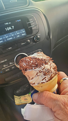Nice little ice cream place with a typical small town feel. They have cones, sunades, and parfaits, and the staff are friendly. We ordered a hot caramel cake (without whipped cream), and it was delicious - with the soft and creamy icecream slowly melting over a slice of warm cake, all topped with sauce. We also had a regular chocolate cone, which was smooth and creamy, but felt it could have been a little more chocolatier :) They have picnic tables all around, where you can sit and eat the icecream, and also have a drive-through window if you want to order from the car.