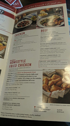 The wife and I decided to go here for breakfast. And, once we got our menus, we were very excited to see that Bob Evans had finally brought back one of our old favorites, their Fried Chicken! However, it was explained to us that the "fried" Chicken was actually the Broasted Chicken that they drop in a fryer for a few minutes to get it crispy. Im not sure who taught them to do that. But, where Im from, that is NOT how you fry chicken! So, we passed on that option and went with our old stand-bys. The food was good. And the service was too. But, the Executives at Bob Evans should NOT be trying to pass off broasted as fried. At the risk of stating the obvious, its called broasting because its a different cooking technique. It doesnt even taste the same! What they call juicy, translates to my tongue as greasy. Ive had it before, when they first brought it out. And I decided then that it wasnt for me. So, needless to say, I was just a little upset to find Bob Evans offering of their "New" Fried Chicken, to in reality be a re-branding of what theyve been selling for years now. Broasted is NOT fried! They really need to change that!
