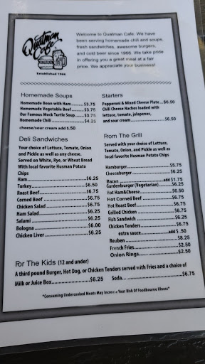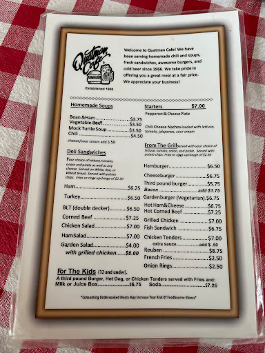 HI,I visit Quatman Cafe Alot.It is a nice place to eat.The servers take good care of you. I have been down on my luck lately and one of the girls or cook has helped me with something to eat.Again I think them very much.I am getting a little better know but still a couple weeks away from getting back to wear I was.I am hoping to continue my visits to this fine establishment.I hope can come and buy my lunch again soon and not need the manager or very nice servers to buy it for me..My son also has been with me a couple times.THis srarted about 6 months ago.Again thanks everyone at Quatman Cafe..Michael