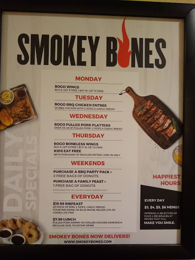 I wanted to give this place more stars because the staff was super friendly and the atmosphere is great, but unfortunately the food and prices deserve this rating. (For reference - my husband and I are recent college graduates and newlyweds, so were not super picky professional food critics or something. Were just down to earth people who love good BBQ). My husband and I received a coupon in the mail and went here for Valentines Day. We ordered the pretzel bones appetizer, and I was shocked when it came to our table. This place basically serves bowling alley food - you know, the super greasy, swimming-in-nasty butter food you order at a bowling alley - not because it sounds good, but because youre starving and will eat whatever? Thats the appetizers and side dishes at Smokey Bones. Our "queso dip" was butter and a few globs of what looked like cheese, but the greasy butter had separated from the cheese, so it looked so gross. The pretzel bones were incredibly greasy and you only get 4 for $8 - the appetizers are RIDICULOUSLY overpriced. We each ordered the Pulled Pork Sammy, and I got loaded fries as a side dish, and my husband got the Mac n cheese. First of all, they charge $4 for these so-called side dishes, so I was expecting them to be pretty great. It was literally bowling alley food again - we only had a couple bites of our sides. The sandwiches were the only edible thing - they werent memorable or super great, but they did have a decent smoky flavor. If we hadnt had a coupon, the meal would have cost between $40-$50, which is ridiculous for the quality of their food. We will never be back.