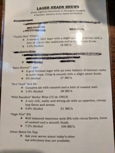 My wife and I went to Lagerheads two weeks ago after a round of golf at Bunker Hill. We came in at 8:30pm and found out they close at 9pm- but no problem, there were a lot of customers there like us who stayed way past 9pm. We were seated immediately by a friendly hostess and ordered the ribs and a couple of beers. The ribs were only $18 on Sunday for a full rack, they were good and very tasty, but not very much rib meat. Fries came with the dinner so we were very satisfied with the meal and the craft beers were absolutely wonderful. Great restaurant with a fun atmosphere, the guys who owned the six Harleys outside were well behaved and added to a wonderful evening. The waitress and service she provided was the best. Thanks.