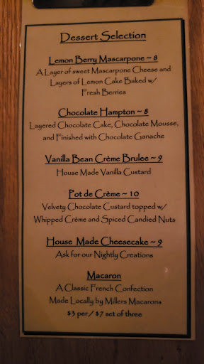Outstanding wine bar. Meals are creative and very well prepared. Portion sizes are smallish, but right if you get appetizer and desert. The classiest atmosphere for dining on Main Street.