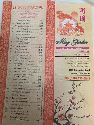 Have eaten at Mings for years! The chicken and broccoli is some of the best around.the General Tsos isnt great, but its not bad. Wonton soup is awesome and the egg rolls are lish!also try the Ta Chien chicken. And sa cha chicken is you like spicy. The sweet and sour is yummy, but sauce is quite sweet. Overall, best chinese in Norton/Barberton area.