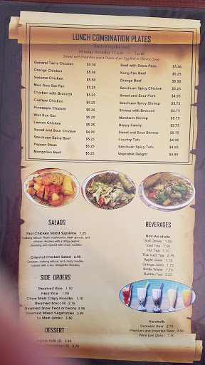The location is great as its downtown near a nice park with water fountains for kids to play in, and to find a shady spot to sit, talk, relax, read a book, or just enjoy a nice day. The service was friendly and helpful in making recommendations. They do offer and can make various vegetarian and vegan meals and have tofu available. The menu has a lot of food choices. The food seemed right on par with most of the other Oriental restaurants that I have eaten at. It was good, but not spectacular. The inside was very dated like from the 1980s, with the old dark wooden tables and seats. But overall its a nice place for Chinese / Thai food. Prices are as expected and similar to other eateries of this nature.