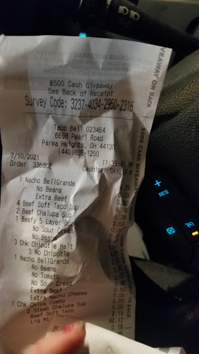 Typical food typical Taco Bell experience nothing outstanding about this location but nothing detracting either.