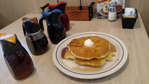 The greeter didnt acknowledge that we were waiting to be seated. The booth we were placed at was surrounded by tables covered with cluttered messes that didnt get cleaned up for nearly 40 MINUTES. After our food arrived we had to point out that we had no silverware. My wife had ordered a side of pancakes, which was not delivered to the table. When she brought it to the servers attention, the young woman simply said the kitchen had forgotten to make them, and asked if she would like plain toast instead. Near the end we asked for a container for my daughters leftovers (grilled cheese). The server returned with what appeared to be small soup containers, capable of holding a few ounces of liquid. My wife sarcastically said that we would instead use napkins, and thats what we were brought (our fault, I suppose). The food was noticeably overcooked, though at that point our overall moods probably influenced our perception of what the kitchen had sent out more than their ability.