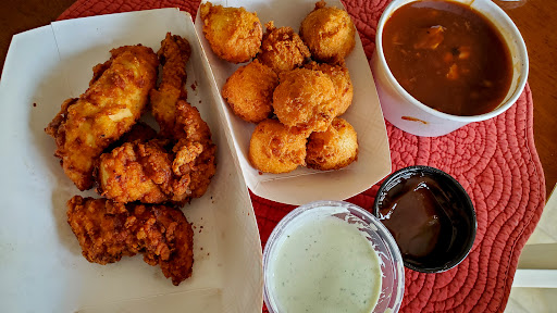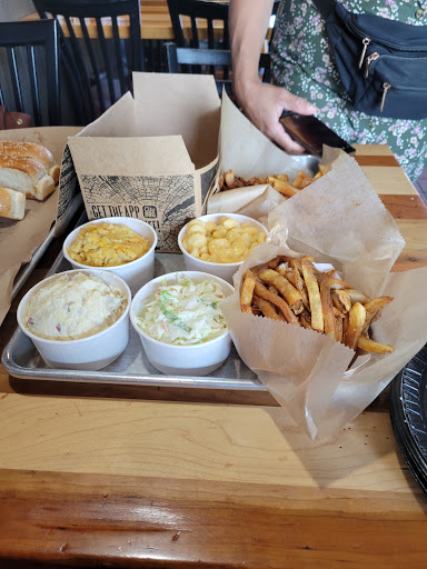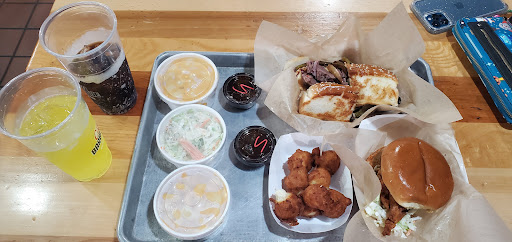 Great food, quick. Super tender brisket, condiments in a cool tool chest, sweet corn pudding, classic sodas. The catfish was really good too. The potato salad was good, but kinda mashed. The BBQ beans had too much sauce, but the chunks of brisket in it made up for that. The green beans with bacon were not crunchy and pretty good. My brisket came as a lunch size sandwich, and it filled me up.