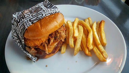 I took the family here last night. At first glance of the menu I was excited. It was our first time eating at a smokey bones and since Dardin owns it I thought it must be good. Well the apps didnt look anything like the menu pics. The pretzels were greenish, the sampler was done in old oil which made everything pale brown, and the sauces were runny and appeared to have sat in the window for too long causing weird bubbling. I ordered the santefe burger which was so greesy I had to eat what I could stomach with a fork. Thankfully after I cleaned the barbeque sauce jars, and scraped the bland tasteless version of guacamole off, I was able to drench the greesy bites in some bbq sauce which made it more palatable. My wifes Salmon was supposed to have some stock reduction on it but the watery sauce was made with chicken stock. Chicken stock on Salmon? The highlight was the ribs. We ordered baby back full rack for my kids to share and it was pretty good. The ice cream we ordered for deserts had ice chuncks in it from freezing and thawing. Overall very dissapointed. It is obvious that both the front and back of the house management is suffering from a serious case of dont give a crap. If you read my other reviews you will see that Im not that hard to please. Will likely never return...