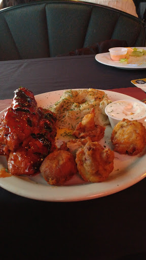 Food was great and the service was spectacular! Guess I had a different experience from the other reviewers. We had the sampler to start. It has wings, deep-fried mushrooms, onion rings, and mozzarella sticks. And for dipping you get ketchup, ranch, sweet bbq sauce(?), and marinara. Best wings I have had in a long time. For dinner I got the shrimp alfredo and girlfriend got crab cakes. The portion size of the alfredo was spot on and it also came with a big slice of garlic bread. The sauce overpowered the shrimp a bit but was still really good. Shrimp was cooked perfectly. The crab cakes, two came in a serving, were deliciously creamy. The crust was slightly mushy but still provided some texture. It has been a long time since I have had crab cakes and I thought they were tasty. Bill came in at ~$45, including two beers. We will definitely come back but next time I am getting the ribeye!
