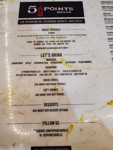 I placed my order online at around 4:15 to be picked up at 5:30 I got there at 5:30 and was told it would be another 5 mins. That was fine. I waited 36 mins! I sat at the bar no one offered me a drink of water or anything. No one told me the status of my order at all. Finally after getting my food I asked for the manager and the server told me some bullshit about the manager knowing and was in the back. I let the server know that I was upset with the services. Walking out I noticed the manager sitting in her car, not managing. I will never go to 5 point grille again. Nothing was compt for current order or future orders. I use to speak very highly of this place but after today they have lost a loyal customer!