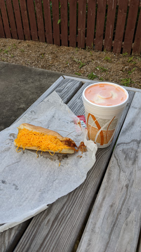 The root beer was flat and watery. The chili tasted mostly of tomatoes and we felt sick afterwards. We ate outside so they gave us a jug and Styrofoam cups so it might be different. Overall the place wasnt bad but also wasnt good. I will say the outside area was nice and clean and even has a small playset.
