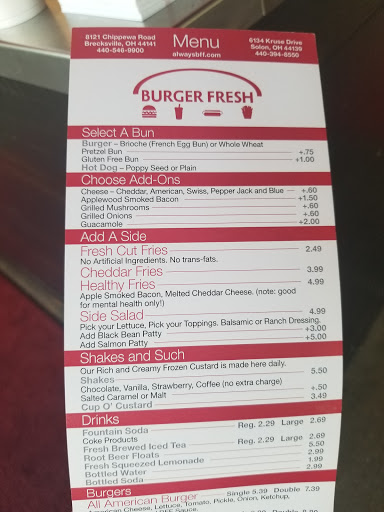 Always amazing burgers. Fast casual restaurant. Set up sort of like subway, you pick a burger type and can then pick everything on the burger. I highly recommend. Probably the best burger in Solon.