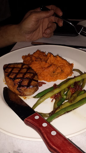 Service and music was very nice. Strip steak was NOT a true strip. Ot was a sirloin cut in sort of a strip shape. Pototao came out after the strip or the so-called strep so I thought great theyre going to have a freshly baked in the meantime it was a bank that was sitting around for a long time. But like I say the server was great the Pauly the musician was great the weather was great but the food sucked. I eat out 6.5 to 7 days per week in this was probably the worst meal Ive had.